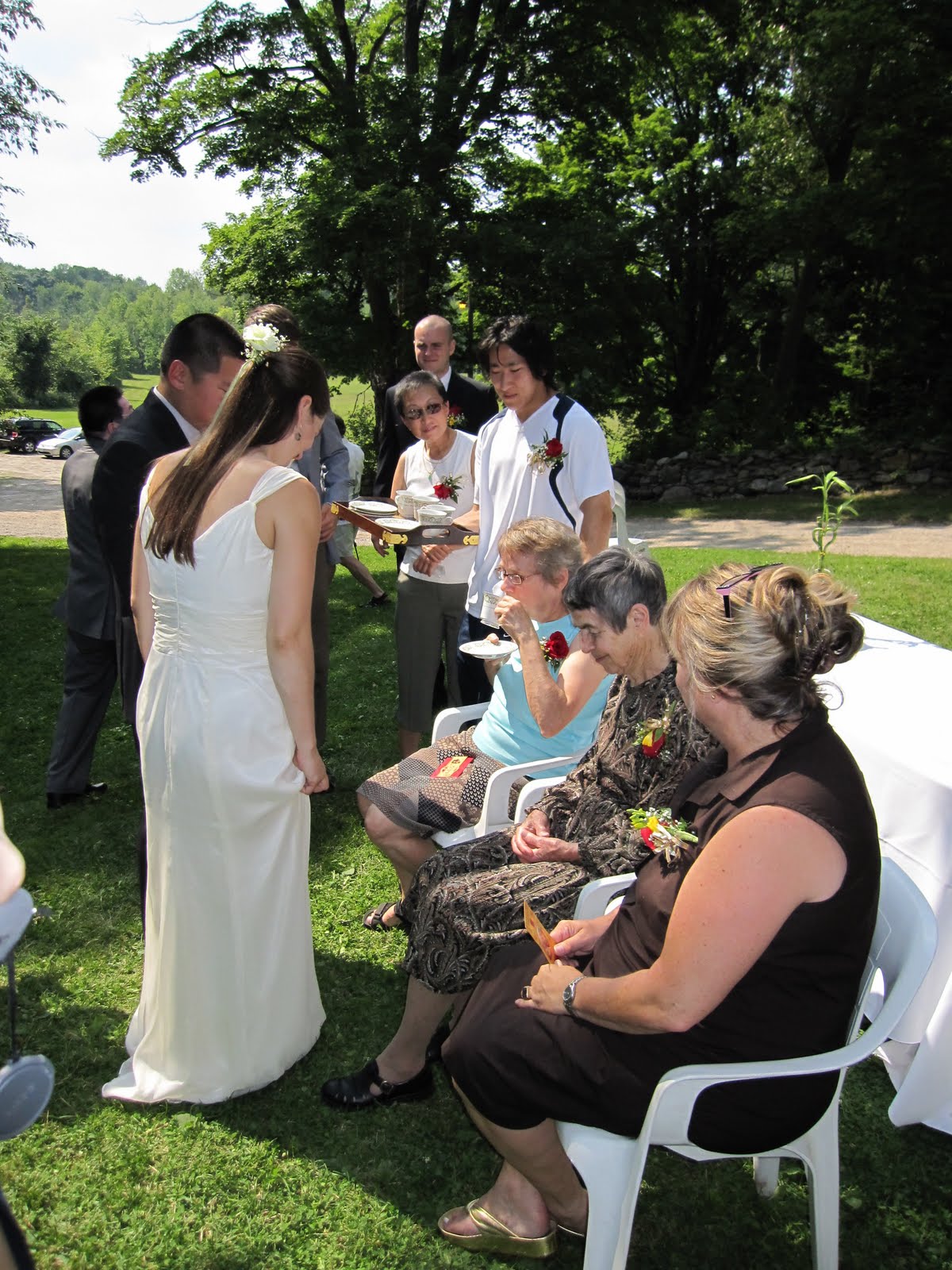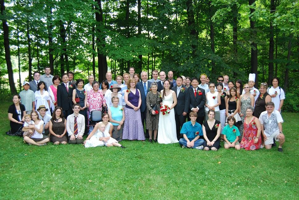 The wedding took place on a lovely day in August at a former farm (now serving as an event site owned by the University) an hour’s drive from Toronto. Most of the guests partied late and camped or slept in the dorm room overnight. The photo above shows me with my mother and sister taking part in a tea ceremony with the bride and groom. Below is the entire group of guests (even including the photographer/friend, the cakemaker/sister-of-the-bride, chef/brother-of-the-groom, florist/cousin-of-the-groom, videographer/cousin-of-the-bride.) It was a beautiful day and everyone was happy. Most of us partied late and camped or slept in the dorm room overnight, for brunch the next day. I thought that two highlights of the wedding were the guest participation in the preparations and activities, and how relaxed everyone was, including the bride and groom (although that may have been a good act).