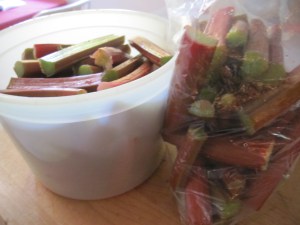Step 2 – Rinse and drain the berries, or chop off the rhubarb leaves (and discard them) and chop the stalks into 1″ chunks. For berries, you can skip the freezing step if you want. For rhubarb, put the chopped chunks into a plastic bag or container and FREEZE IT! That accomplishes 2 things: (a) reduces the crisp rhubarb to mush when thawed, which is exactly what you want for Step 3; and (b) more importantly, it postpones the need to embark on Step 3, if you are not ready that day.