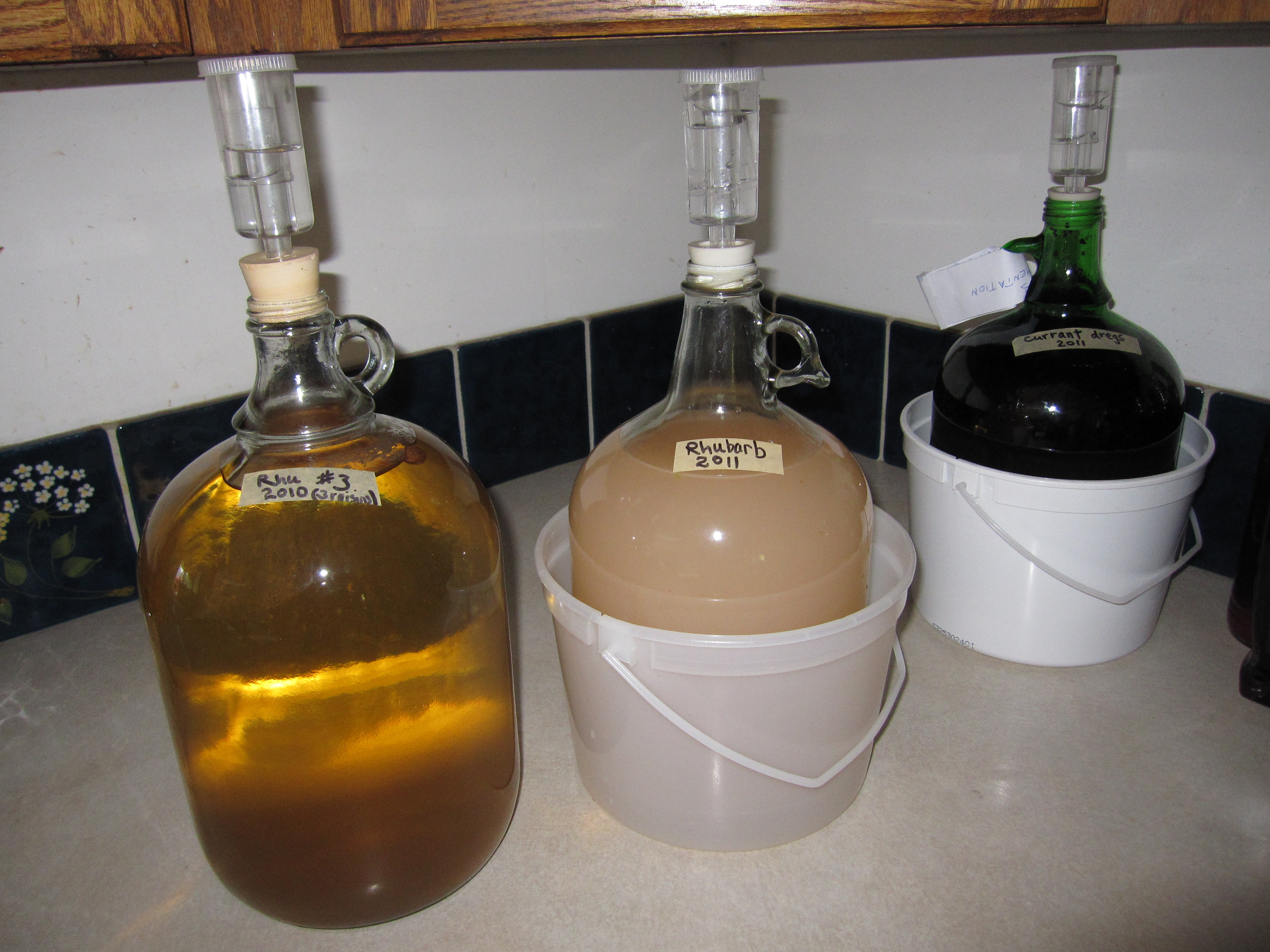 Step 6 – Once you are confident that the bubbling is stable, put the jug in a convenient location where it can continue fermenting for a month or three, If you check, the specific gravity will be just under 1.0. Blackberry wine is drinkable after 3 months, but rhubarb wine really needs the better part of a year or else it will be very harsh.