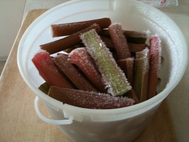 Step 1 – In April or May or whenever the stalks are thick, pick the rhubarb by pulling up on the stalk, chop off the leaves and discard them. Or use about 4 L (a gallon ice cream bucket full) of blueberries, blackberries or black currants. Or a combination. Do not try this with raspberries, cherries or strawberries! Awful!