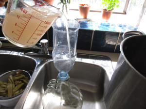 Place an airlock on the jug (also purchased at the local wine making supply store), stand the whole jug in an ice cream bucket, and leave it on the counter for a few days. (Putting it in the bucket is to make sure that it is not fermenting too wildly, such that it overflows and makes a huge mess. Conversely if it isn’t fermenting, you might need to add some more yeast.)