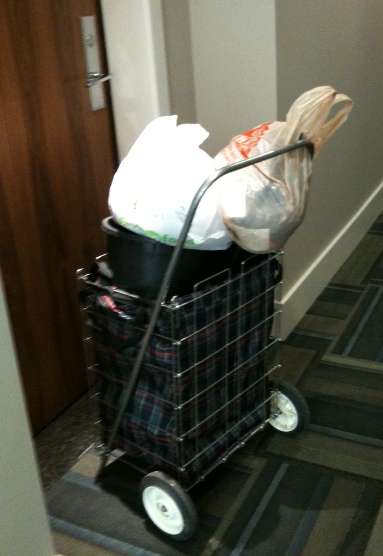 I looked more like a bag lady than a resident of the building when I pulled this into the elevator, but at least I knew how to swipe my fob on the panel of the elevator pad.