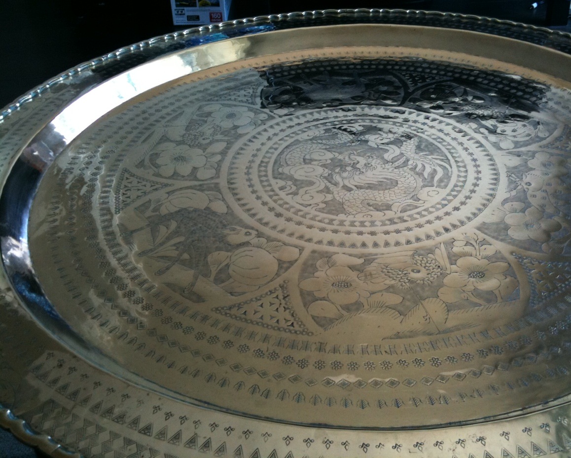 Between 11 a.m. and 2 p.m. it was so hot that I couldn’t walk on the concrete deck without shoes. (And you always thought it rains non-stop in Vancouver.) So I came inside and polished the brass table (handed down from my mother, and also in need of major intervention).