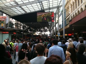 We wandered down to the Queen Street Mall to watch the race on big screens. It was a bit like a tame Stanley Cup final game on Granville Mall, but the mob can only get so excited during a 2 minute event. This race was the closest in history and it took several minutes before the winner was announced. The photo finish showed maybe a whisker difference. Neither of our horses was anywhere to be seen.