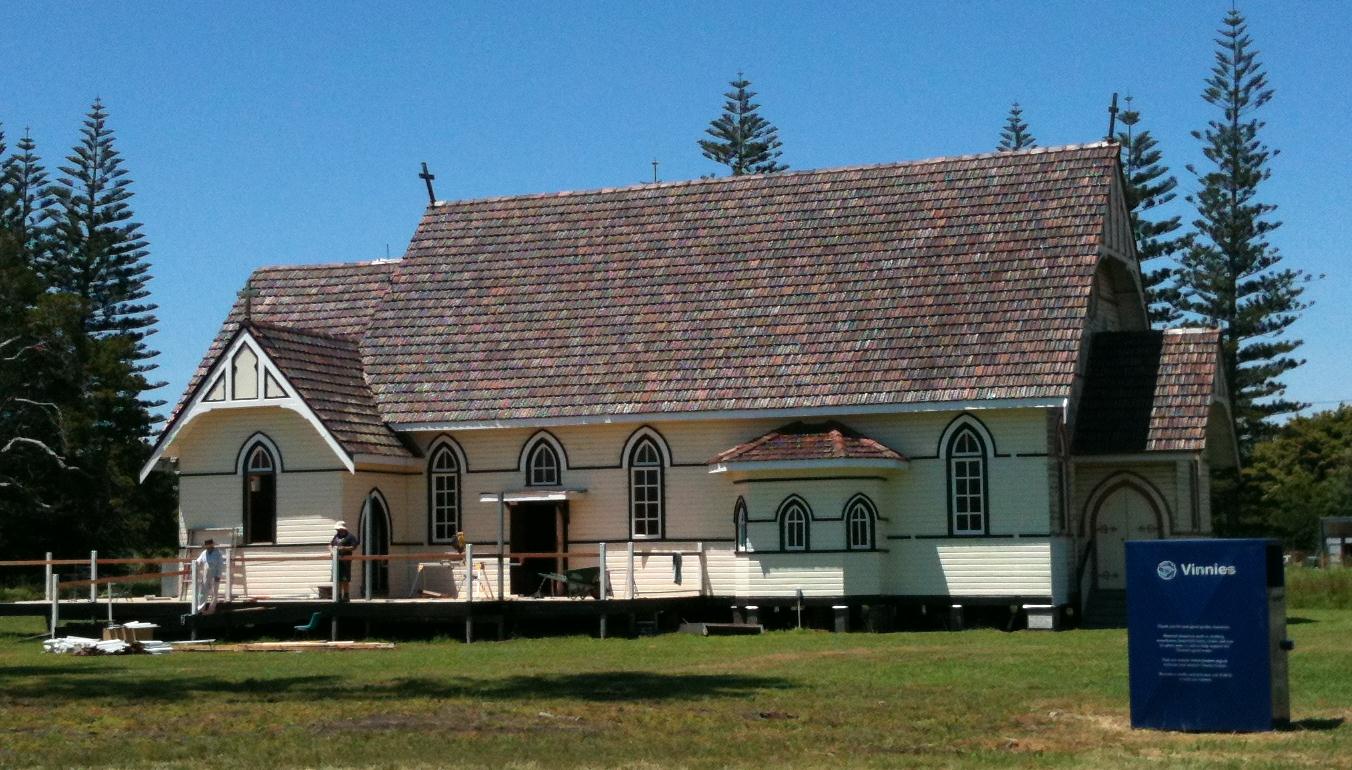 Approaching Broadwater, we stopped to look at the sugar cane fields along the highway. Pulling onto a side road, we found ourselves in the parking lot of a church undergoing restoration and conversion to another use.