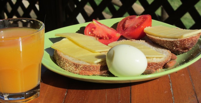 Here’s a picture of a typical meal for us, on the road when we can’t be bothered to elbow our way to the communal kitchen stove. This was a breakfast, as evidenced by the orange juice instead of wine. A lunch would have been the same as shown, except eaten out of the trunk of the car and the juice drunk from the original container. I learned to carry a small bottle of balsamic vinegar in my travels. A splash of that can enhance an otherwise bland meal and it doesn’t even need refrigeration.