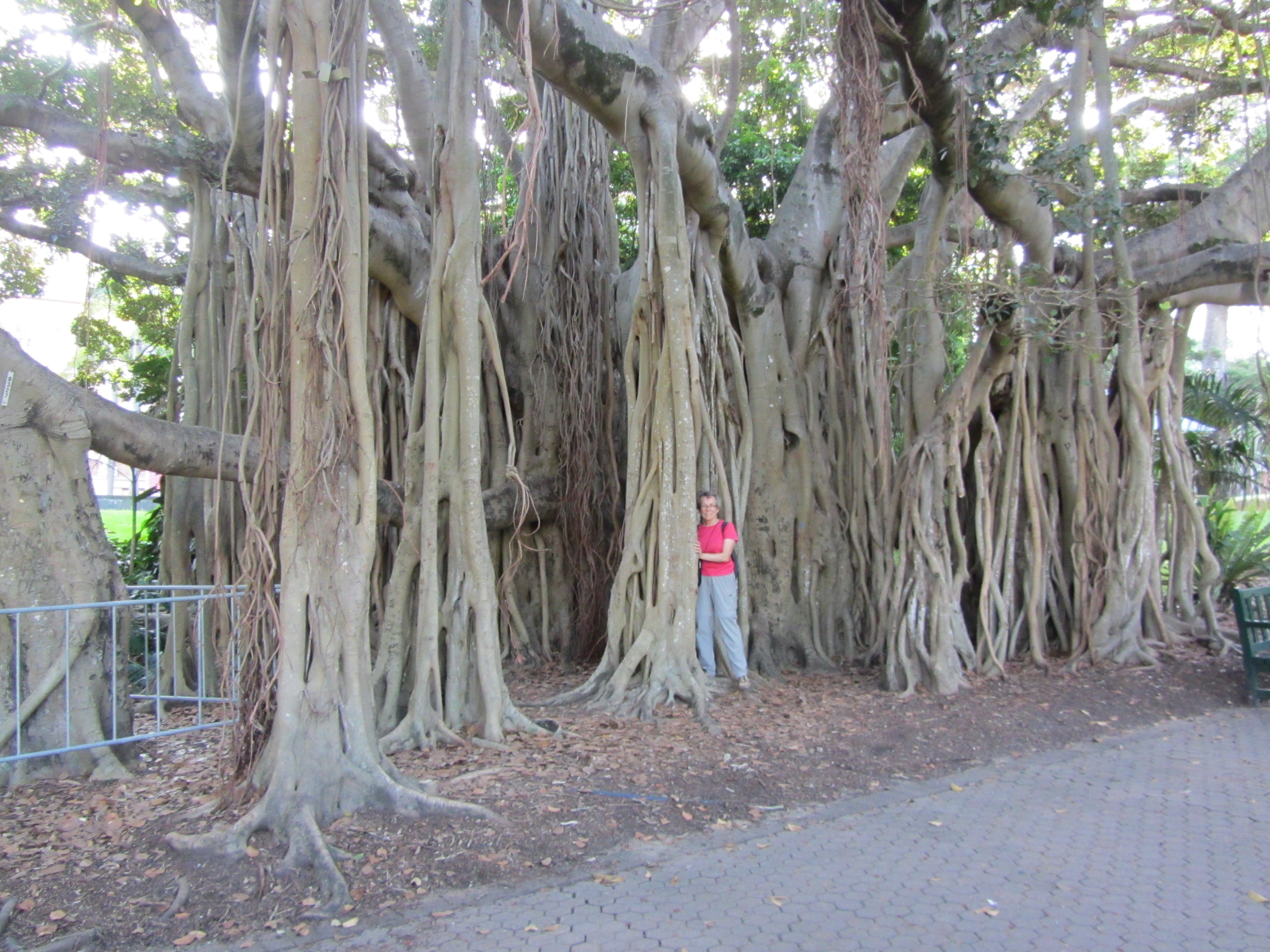 This photo is of a banyan fig (Ficus benghalensis), the national tree of India, in the Brisbane Botanic Garden. It could be up to 100 years old or so.