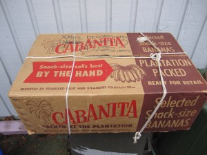 CARDBOARD BOXES: I visited my mother and took away a large cardboard box of Christmas decorations that she has been saving in hopes that someone will want to use them. It has been stored in the basement and garage for years, and smells as musty as can be. The contents are the things even SHE doesn’t want to use – replacement light bulbs for obsolete types of light strings, outdoor spot lights, Christmas tree garlands including a fuschia-coloured one that won’t be put on any tree I ever control, and a few glass balls with the paint peeling off. She let me take them away to give to my kids, or use myself, or throw away. She was willing to part with them at last, but SHE WANTS THE SMELLY CARDBOARD BOX BACK! Only because it fits nicely in another trunk. Both would be empty, like many of the boxes she keeps. {Hi Mom – I’m just making this up to entertain my readers.}