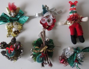 I felt guilty about discarding a bunch of carefully-saved tacky little corsages and miscellaneous bits and pieces. I examined them carefully to see what bits were salvageable. In order to assuage my guilt about the smelly box, I decided to make new corsages using parts from the old ones, rather like the ugly sweater or Christmas sweater events.