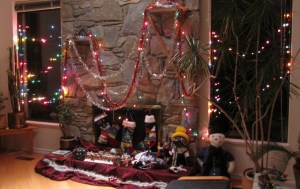 Instead of a tree, I carefully decorated one side of the living room. I’m quite pleased as I think it looks Christmassy but it was very little work. I love the casual stringing of the lights – I tell myself that it looks informal and “natural”, and I didn’t have to deal with evergreen needles, falling tree, sap on the hands, tinsel on the floor, hooks or clamps to keep the lights straight.