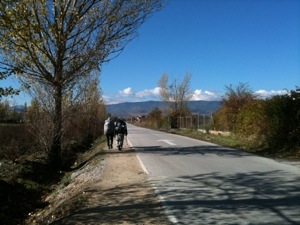Good news is that yesterday as we rested in the sun in an endless hill of vineyards, we were passed by the Japanese couple that we last saw struggling in the hail and sleet. He seemed to have a walking disability and we couldn’t imagine that they could have gotten much further that evening. Turns out they took a taxi to the next town that night. Here they are in the photo.
