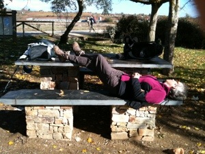 We decided to step up the challenge slightly so we did 25 km yesterday and again today. That involves about 7 hours, including a 30 minute break with boots off (as illustrated), and much dawdling.