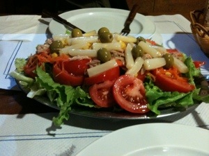 All along the pilgrimage, restaurants, bars, and pensions offer a Menu del Dia to pilgrims for a price of €8 to €12. This price includes a choice of starter such as soup, spaghetti or salad; main course of thin steak (chicken or veal), ribs or something else like trout, always served with French fries; a dessert; and either bottled water or local wine (usually a half bottle).