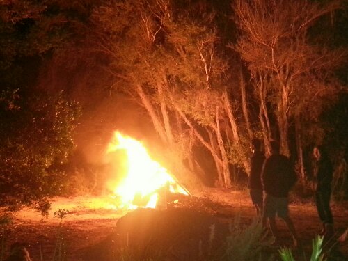 There once was a family cottage with a cupboard unit from ancient history that truly had outlived its natural life, even in a family of committed of recyclers, upcyclers and bicyclers. However, due to presumably misguided and arbitrary garbage collection policies of the village council, the family Matriarch had a problem. In short, she wanted the stuff GONE. A handy Young Fellow in the group took the initiative to chop the cupboards up and pile them in a heap on top of some nice dry branches that an Older Fellow had collected in the vacant lot next door. They then claimed that the Baby Dachshund (also male and therefore assumed to be another pyromaniac) might have dragged a burning stick over from the barbeque to the conveniently placed pile of unwanted flammable stuff and caused a significant bonfire. Because the water supply to the cottage was a rainfilled cistern, no firefighting hose was even available.
