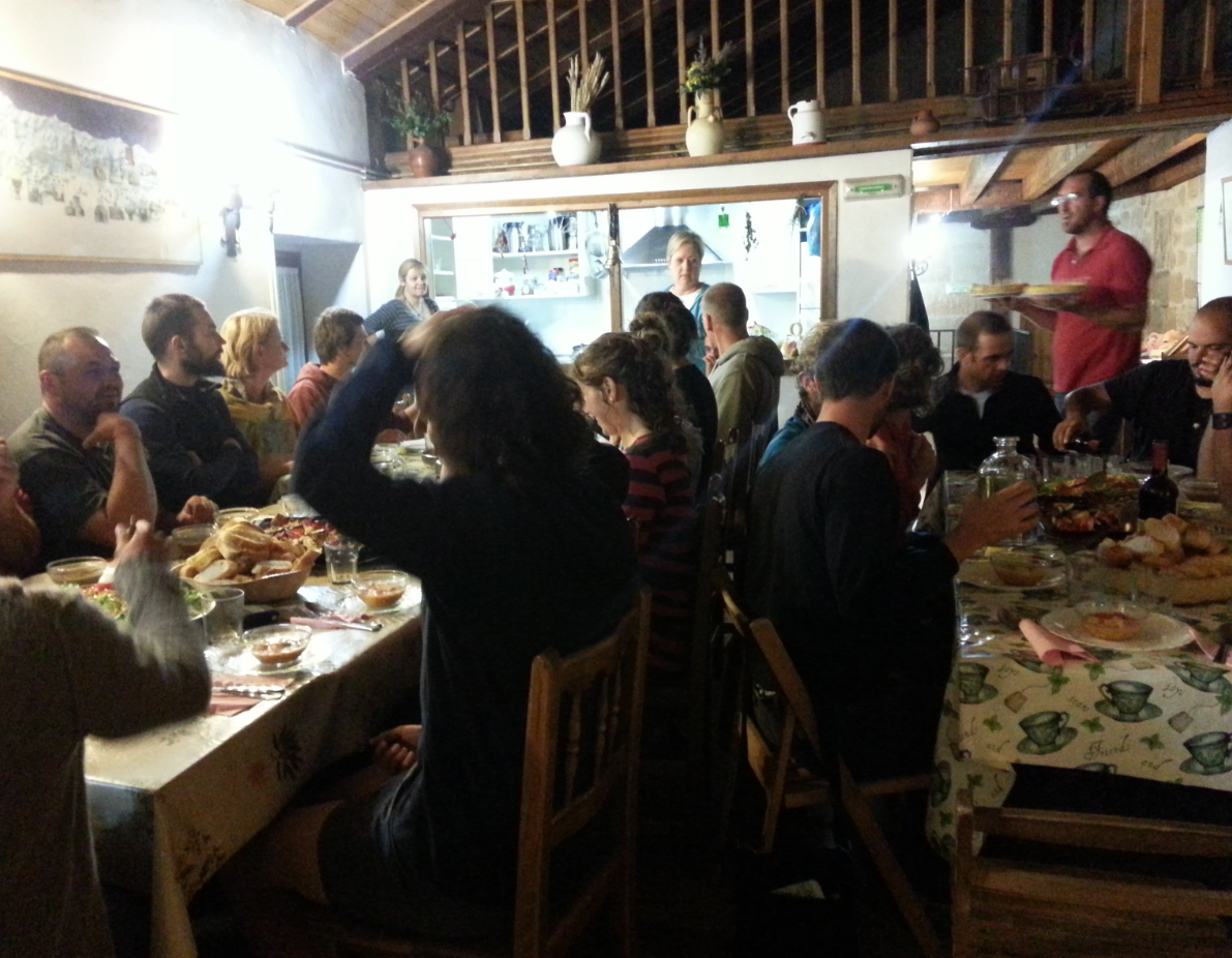 A night at this albergue is known to many as a highlight of the camino – the wonderful volunteer hospitaleros (a couple from California right now, who really are very kind), the communal dinner and cleanup, singing songs in several languages, taking food to be cooked in the bakery oven across the street, having reflection time and sharing thoughts while a candle is passed among pilgrims in the church, everyone sleeping on mats on the floor, breakfast together in the morning. This is a very moving experience for many people. I have read it described as an intimate magical experience.