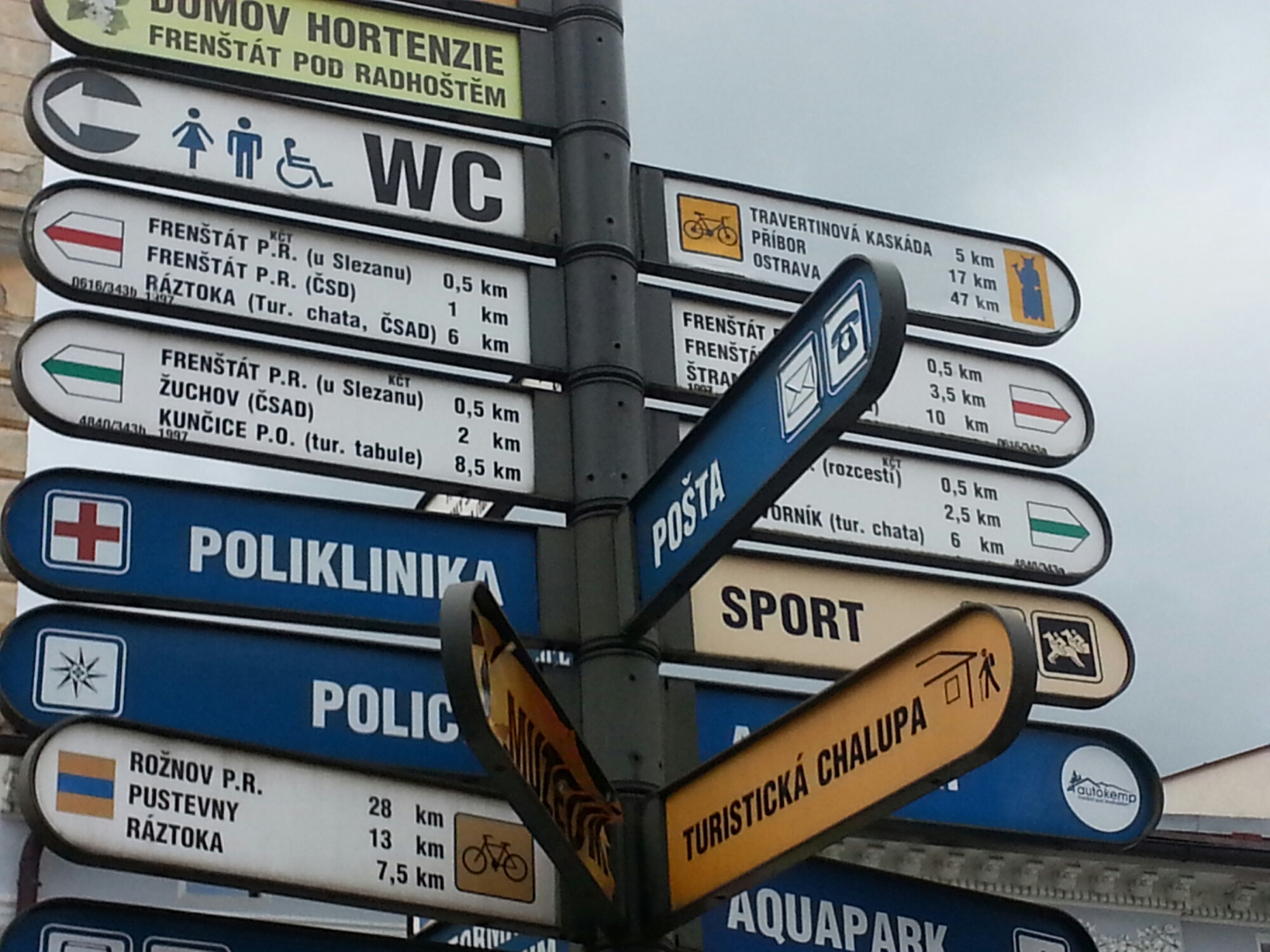 We consulted with Google Maps on the wifi at the Frenstat town square but the results didn’t include the yellow hiking route we had in mind. The sign post showed just about everywhere except our destination.