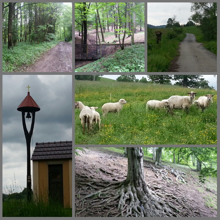 In order to challenge my still-wimpy foot, I set off with N to walk 10 km from Frenštát pod Radhoštĕm to Hukvaldy in the Czech Republic. The weather was dreary and dull with a high of 13 C, overcast skies, and occasional drops of rain. We each wore 2 pairs of lightweight pants, several layers of shirts, rain jackets on top.