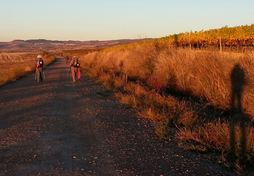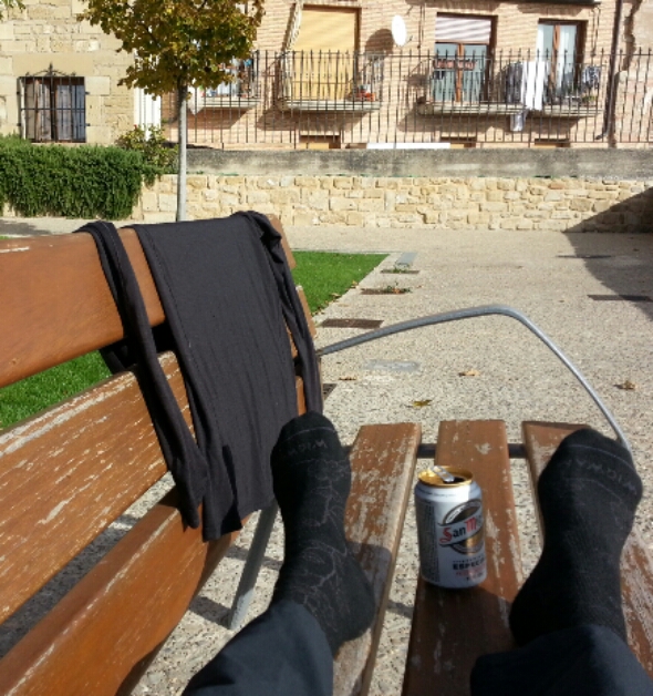 Taking care of necessities – feet up, cold beer from vending machine, washed shirt drying in the sun – in a garden area near the Municipal Albergue in Viana.