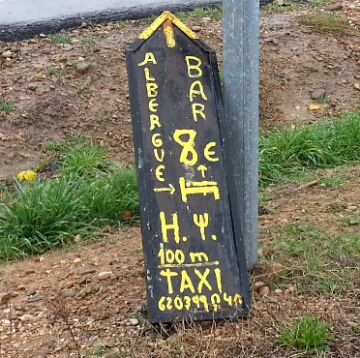 Desperate for a seat in the dry, I saw an open bar/cafe and pushed the door open. Inside were 3 men on one side of a small bar, and a fourth on the other. I asked what there was to eat but I didn’t want a bocadillo (see previous Day 9 post). The bartender suggested some tapas and immediately the old guy beside me said something incomprehensible and put some money on the counter. I figured he was offering to pay for my tapas but I wasn’t really sure, so I thanked him but not too effusively as I wasn’t sure what the transaction was! In any case I was served a plate of tapas along with my half glass of beer. Needing a seat, I took it to the one table in this tiny bar, and ate. It turned out to be liver cooked in some sauce. Not bad, but not exactly what I might have ordered! Here you can seen my snack, the owner’s wine, and the guy I thanked for the plate of stewed liver.