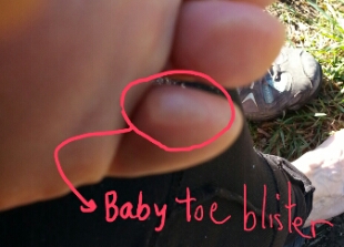 First I had to take care of my blister. Sorry I didn’t keep a good photographic record, but here it is before the sock and shoe went on.