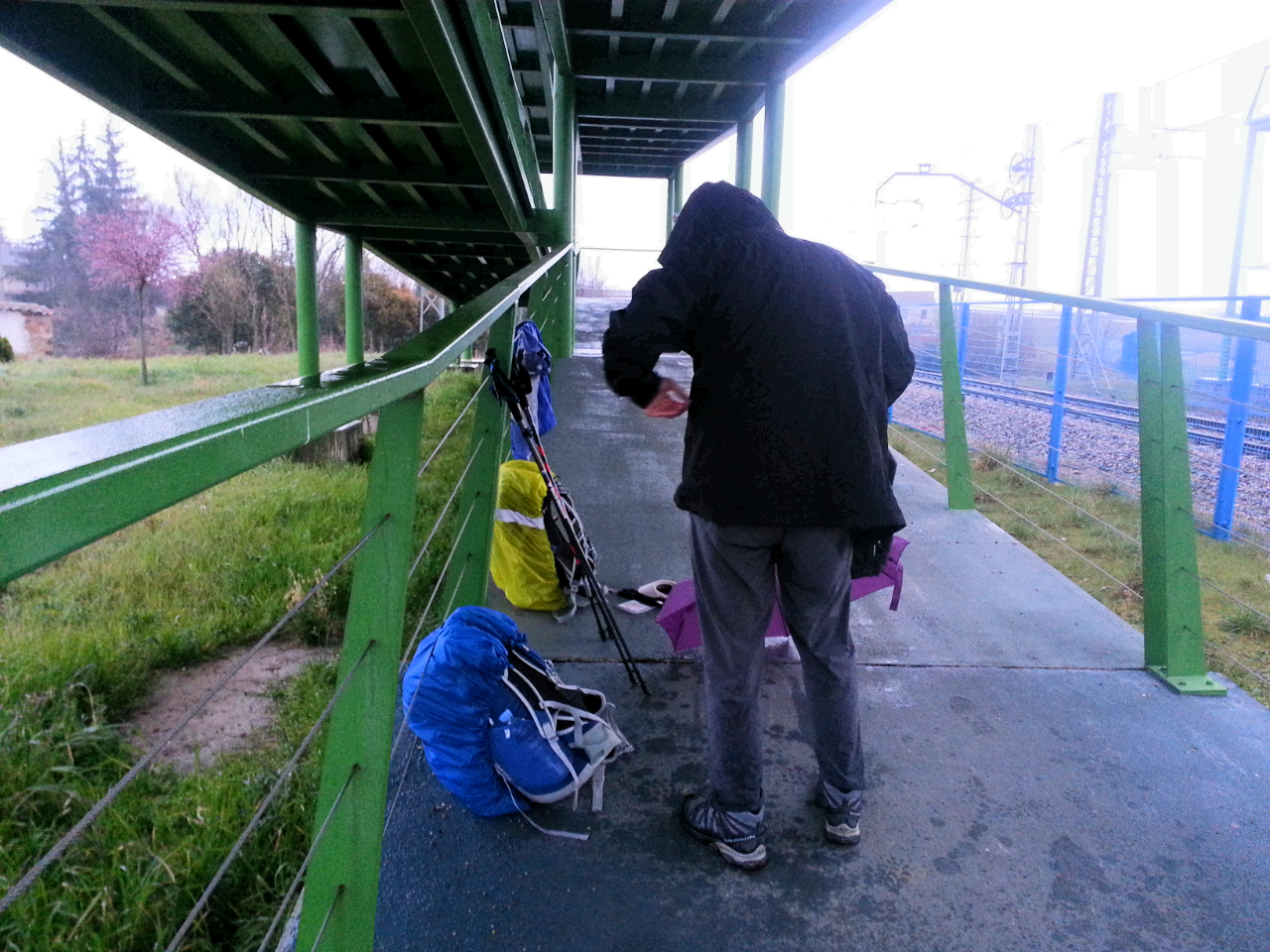At the 28 km point we phoned ahead to make sure a comfortable room was waiting, and we kept walking. Soon the skies opened. It was getting dark and chilly so we had to stop in the shelter of a complicated overpass going over the train tracks into Astorga, and put on rain gear, even though we were only a couple of kilometers from our destination.