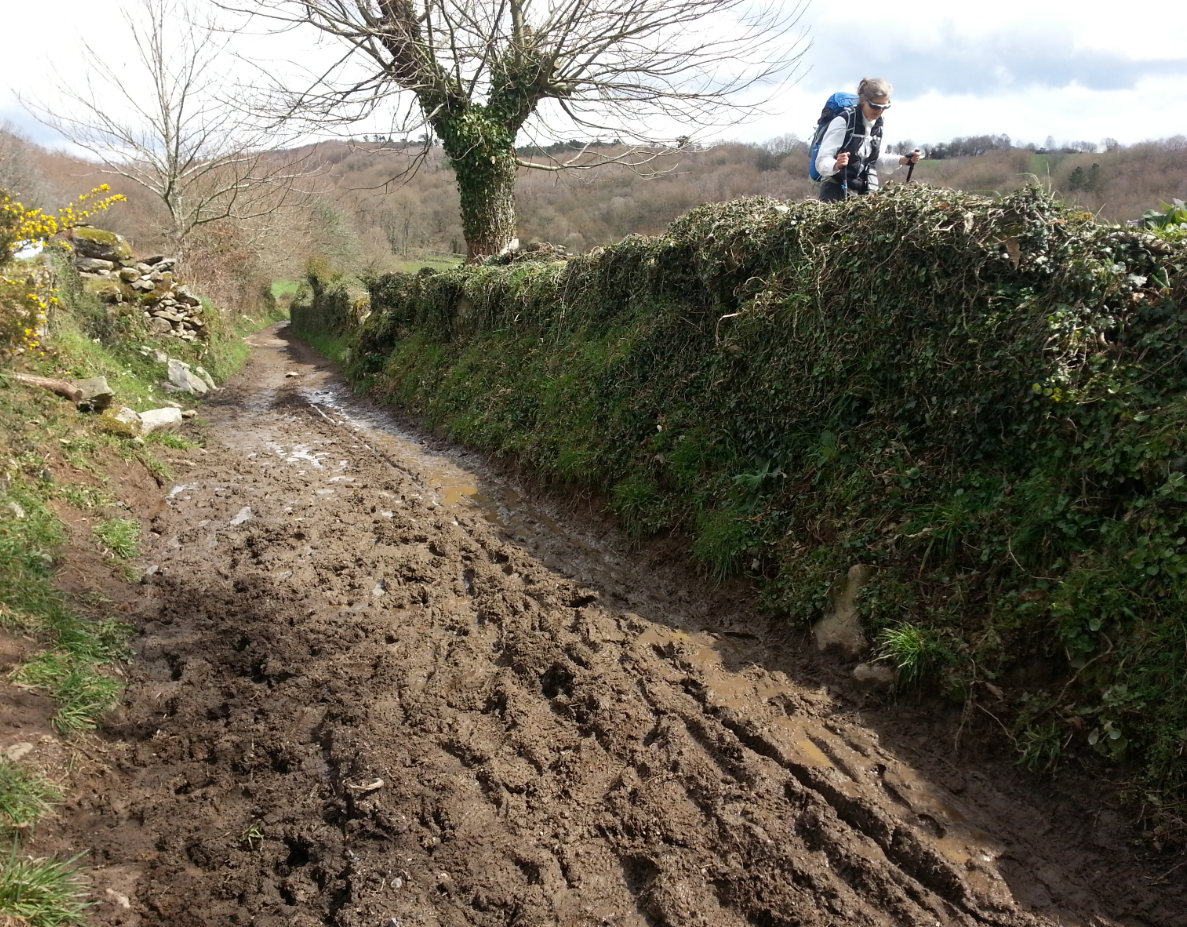 The going was slow through long stretches of puddles and mud. MB thought she was smart when she stepped over a crumbling fence and climbed up to high ground.