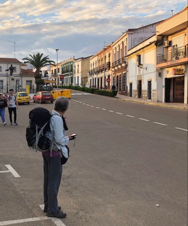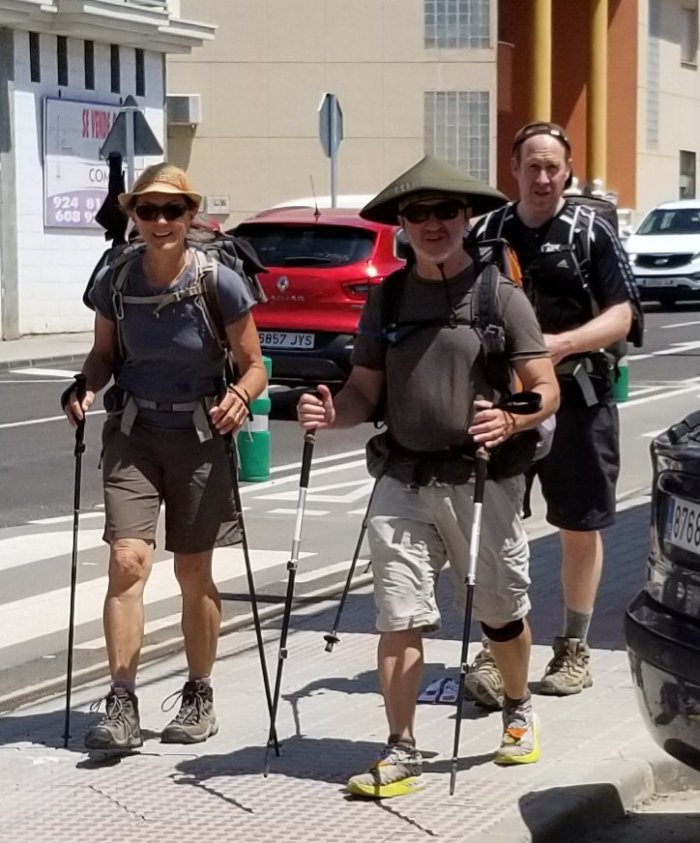 I got word from the pilgrim express that my poles and hat had been picked up and were on their way to Don Benito, which we had already passed through on the bus this morning. After checking into a nice hotel I hopped on a train for the 35 minute trip back. Timing was perfect so I managed to surprise the team as they walked into town.