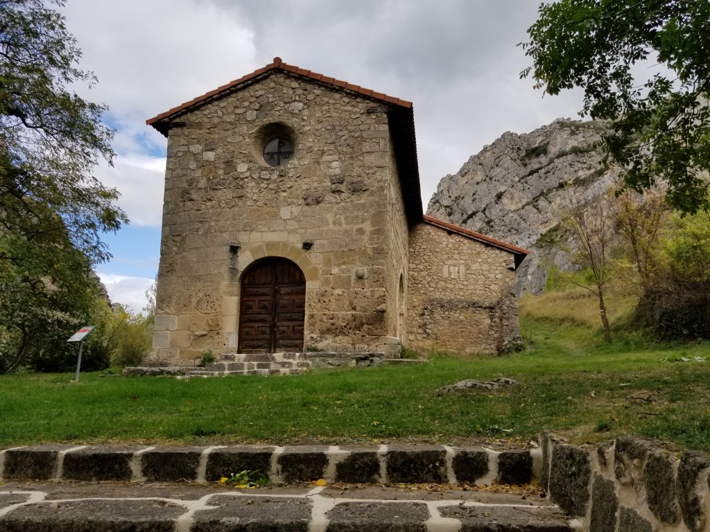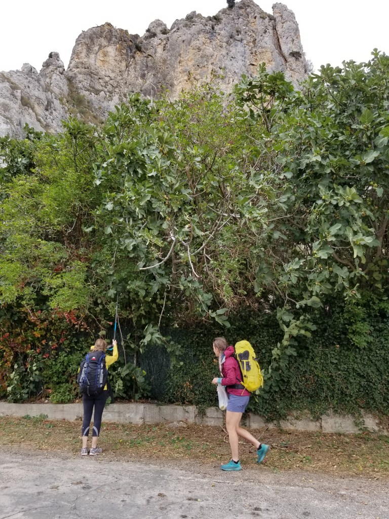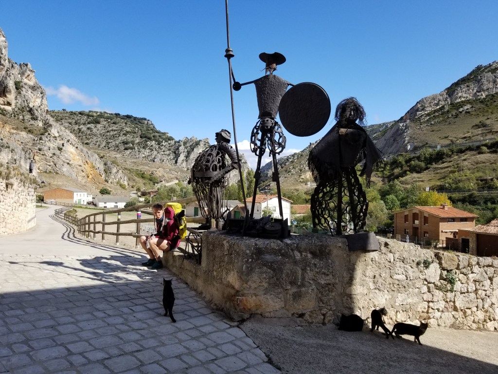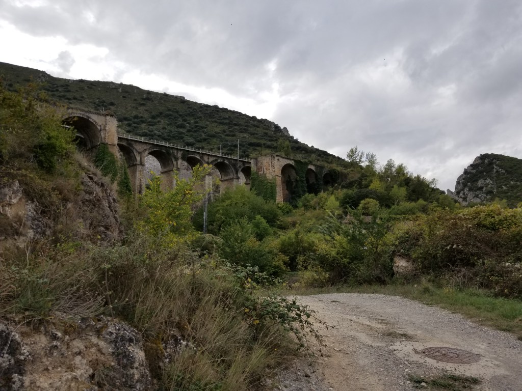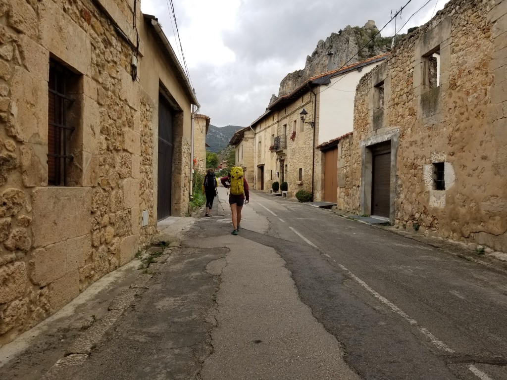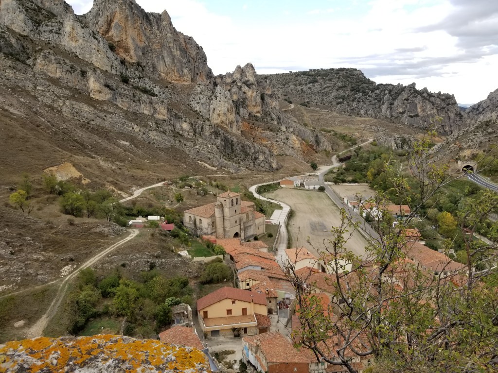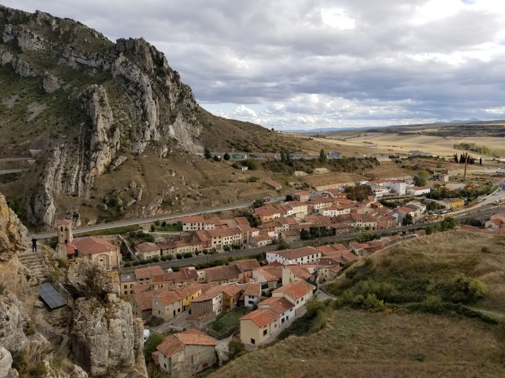 Today was a great day of walking, with varied scenery and many ripe figs. Even some apple trees by the train tracks. As we approached Pancorbo, the wind was very strong. I understand that wind is normal here. In Pancorbo we followed the suggestion from a local, and walked up the path and stairs to a lookout point with excellent views of the town and its setting in the mountains. Our accommodation was the Hostal Pancorbo – basically a truck stop with a nearby store and gas station. We passed a Casa Rural which looked much quainter, but we were happy in the Hostal. Dinner was classic Spanish truck stop menu; breakfast was good. The store had everything we needed for the next day.