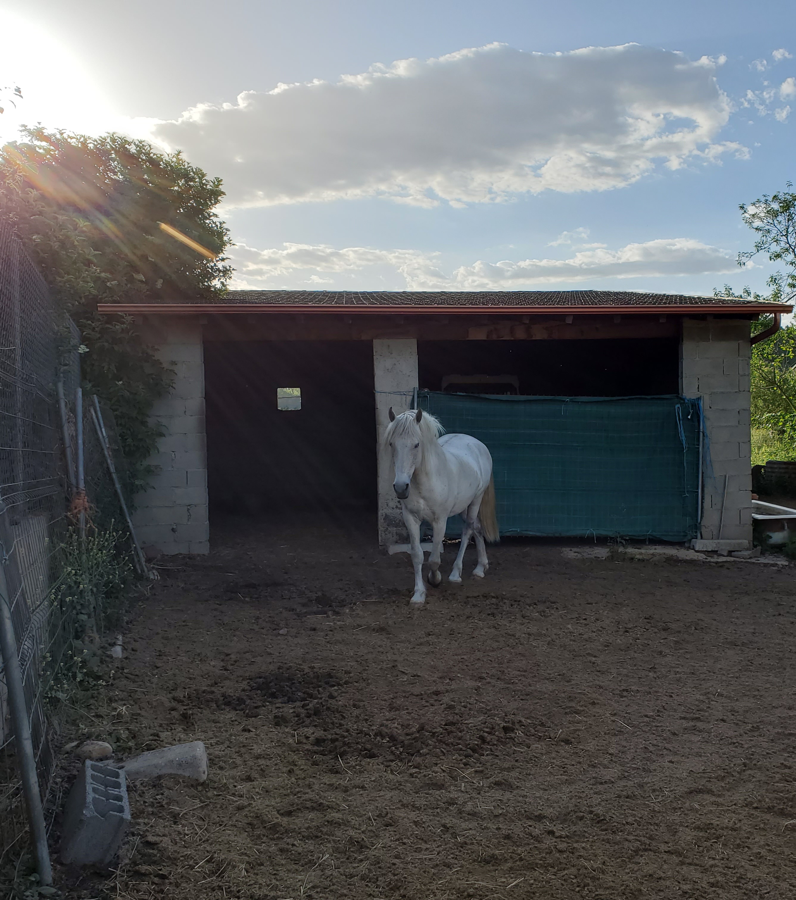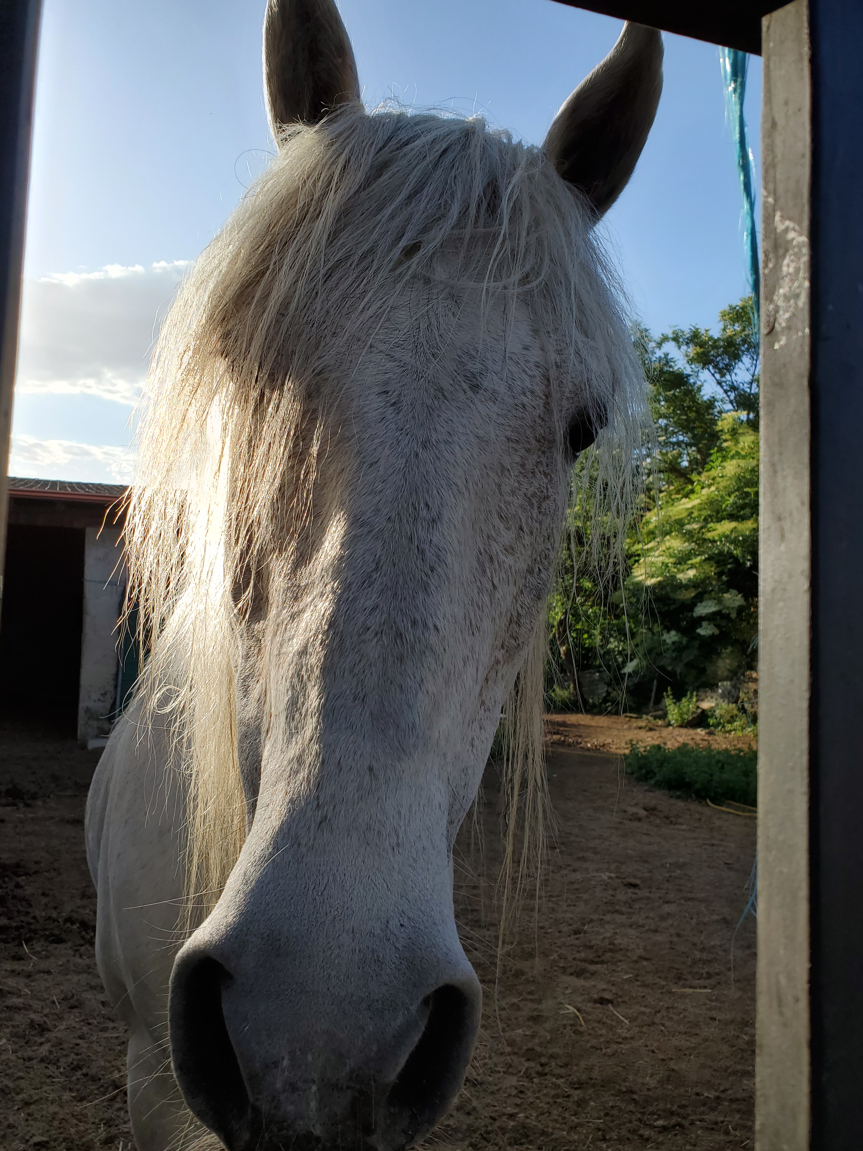 Here’s a friendly horse I passed this morning. I stopped to take a picture just for you, and he came over. A little later, a woman passed me, walking with her dog and cat (in the lower right corner of the photo).