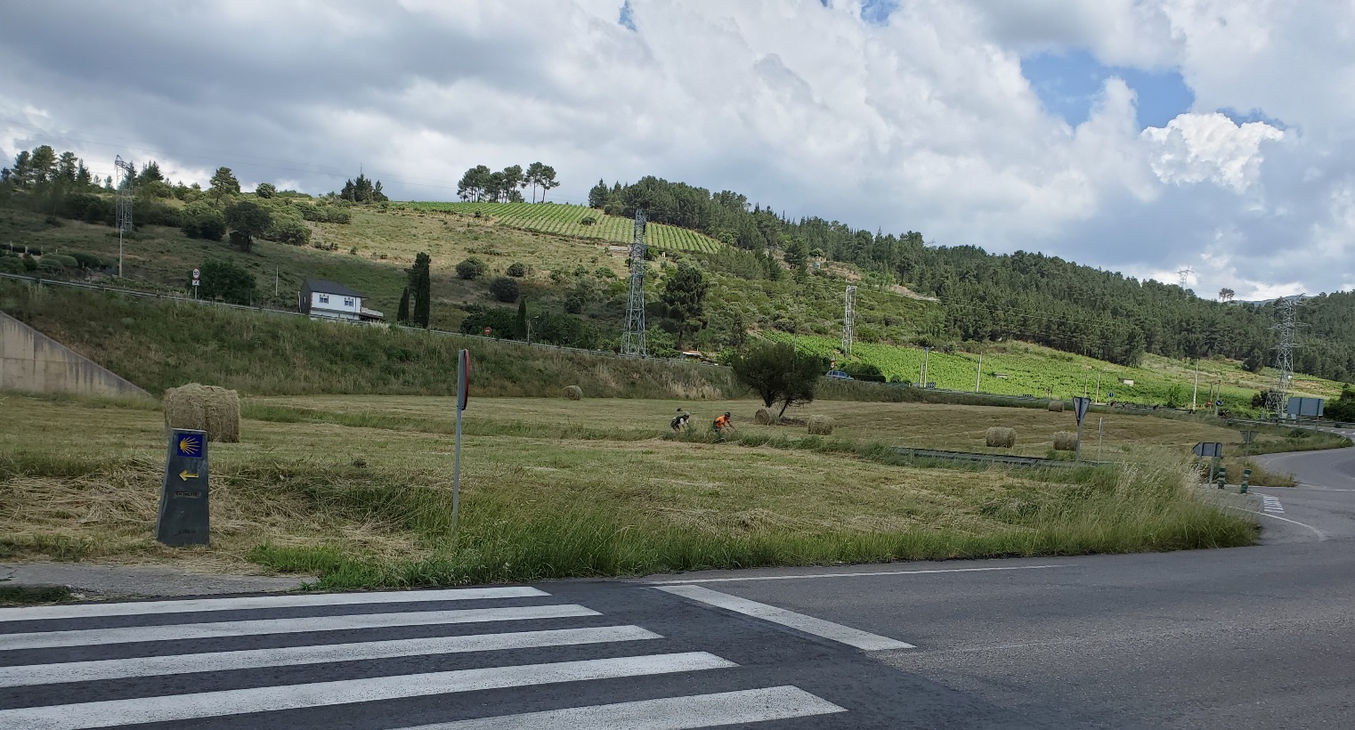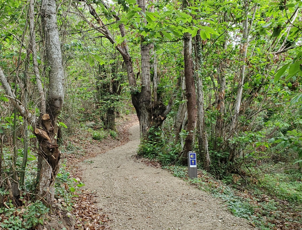 The last section of walking was quite nice, especially the (newer?) option near A Rua that avoids 1-2 km walking along the road that has some narrow shoulders. The path was up on the hillside with good views. [Edit to add: Afterwards some other pilgrims indicated that they hadn’t noticed the optional path avoiding this stretch of road walking. Just after passing the dam Presa de Santiago, the Camino intersects the lower level of old highway and the new highway N-120 passes over. There was a big notice with a map, and the route along the road was quite obvious. For the newer path, you need to cross the road, and walk under the new highway overpass before you see the arrow pointing left on a wide dirt path. Sorry, but no convenient photo instructions!]