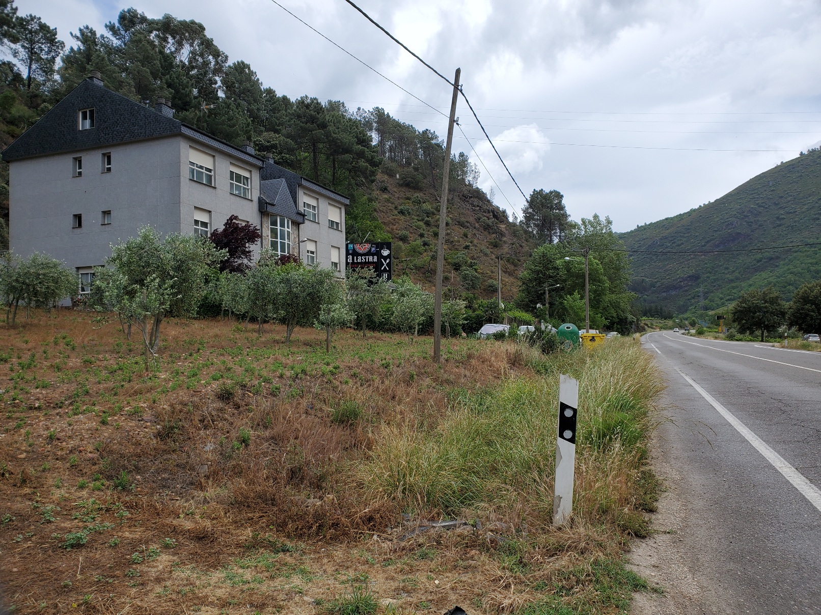 In Vilamartin, I entered the albergue to find that it was somewhat occupied by Ukrainian refugees. There were probably still beds available to pilgrims but I would have to call the posted number. It seemed intrusive to do so, and I found a hotel not too far back on the highway. Well, they had rooms but the restaurant was closed due to a private event. The nearest food was a gas station about 1 km away.