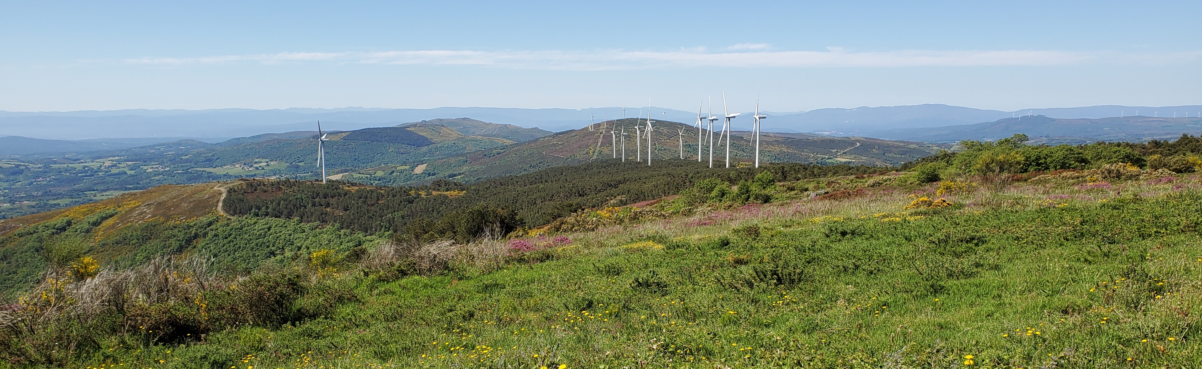 Nearby, two pilgrims from Zaragosa were having a break. Then I walked up to the mirador a few 100m away, for panoramic views of Galicia. I would be walking next along that windmill route.