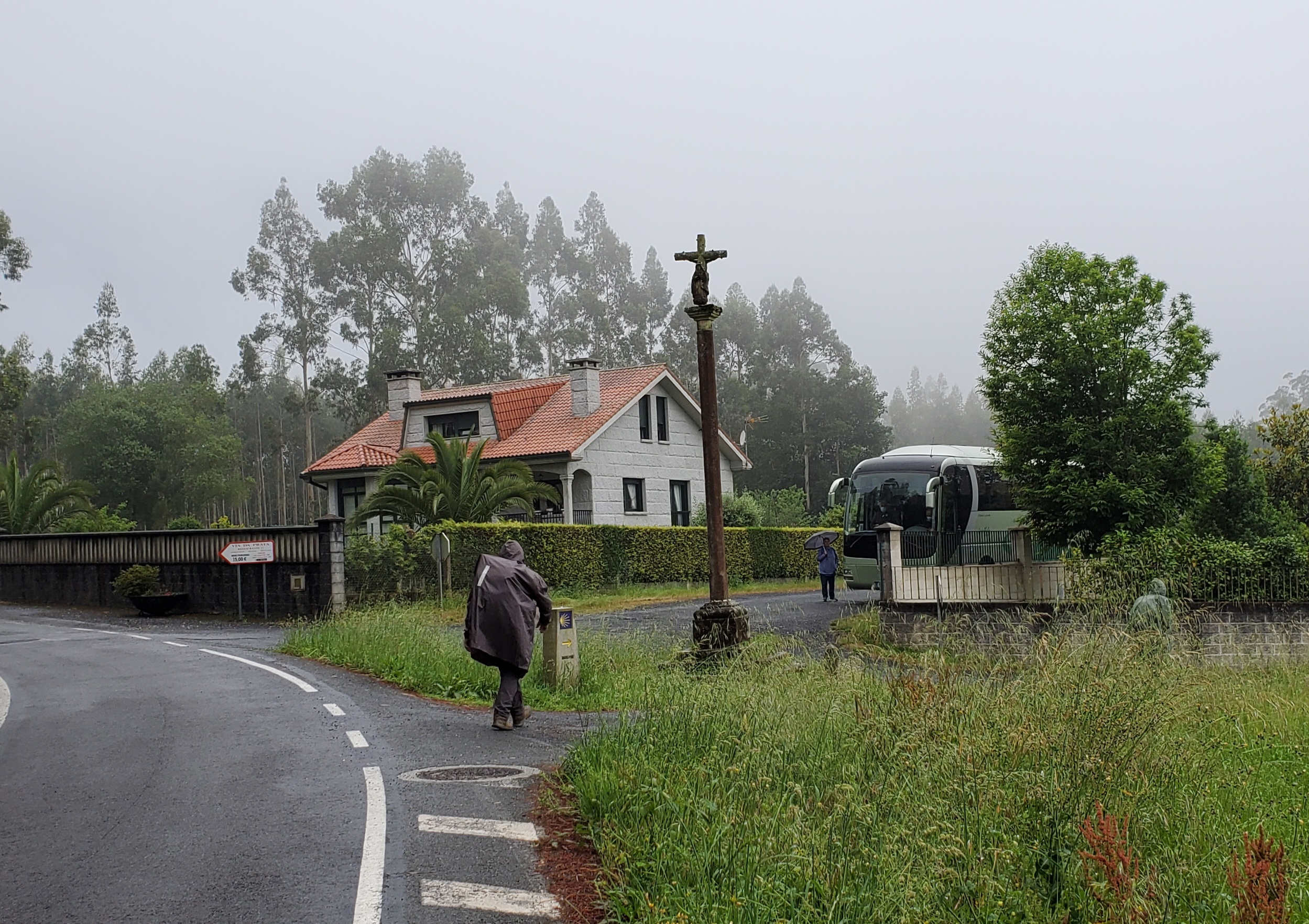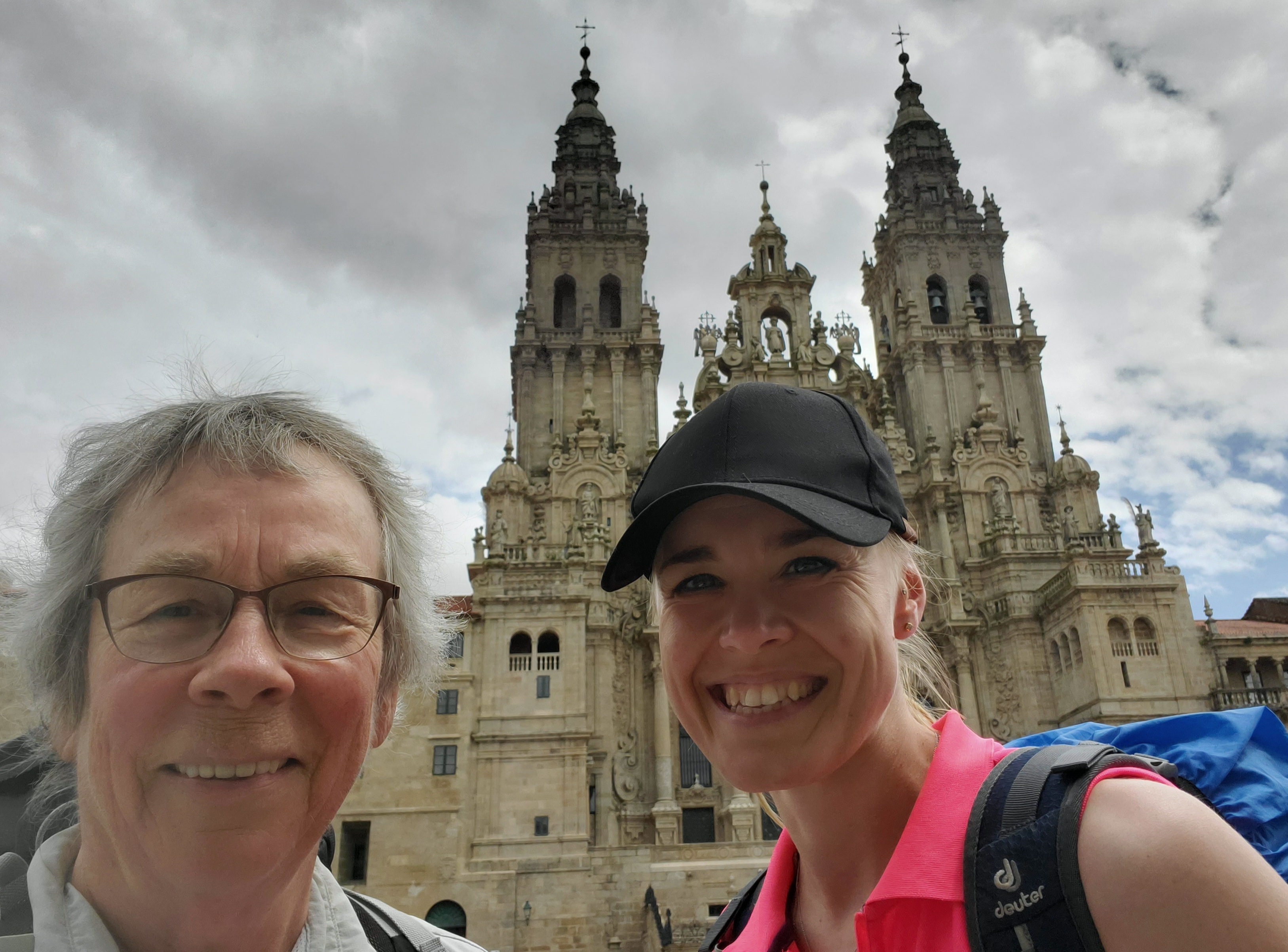 While I was doing a wardrobe change in a convenient bus shelter, along came a young German woman who had scarcely talked to anyone on her week-long camino from Ourense. She was very happy to walk into Santiago with me.