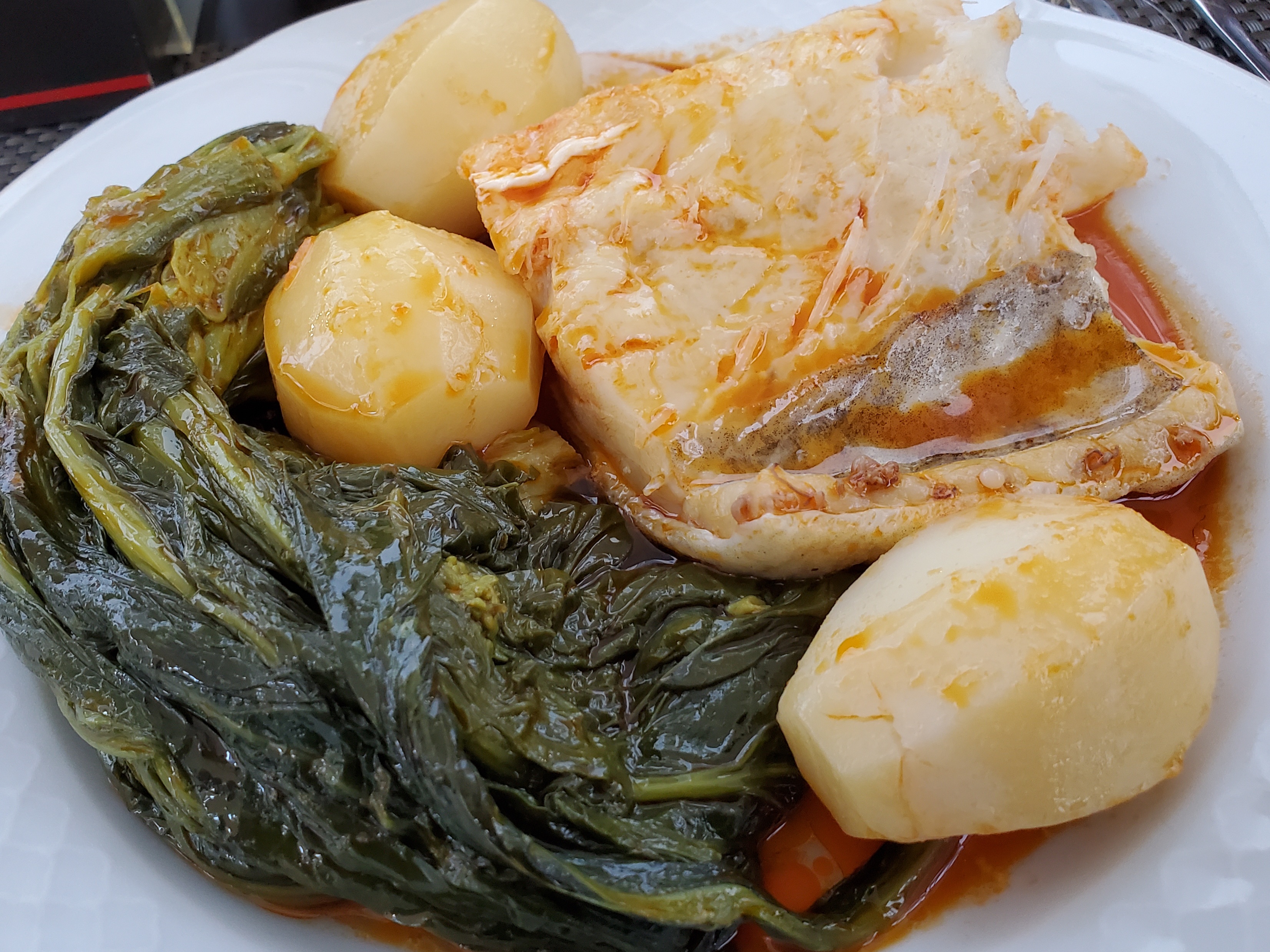 They ordered a seafood platter – Galician specialty – but I avoid shellfish due to some bad experiences in the distant past. I wanted to stay with the theme, so had “bacaloa con grelos” – cod with the green kale-like plant that is found in every garden in Galicia. I tasted one of the famous percebes from the platter. They told me it would taste like the sea, and did – exactly.