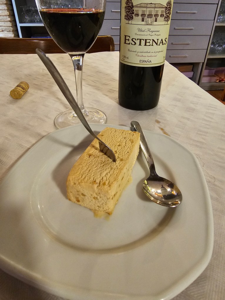 The food was excellent. I had Valencian paella (chicken, rabbit, white and green beans) and stuffed eggplant, with a local red wine, followed by nougat ice cream. €10 for pilgrims, €13 (I think) for normal people 🤣.