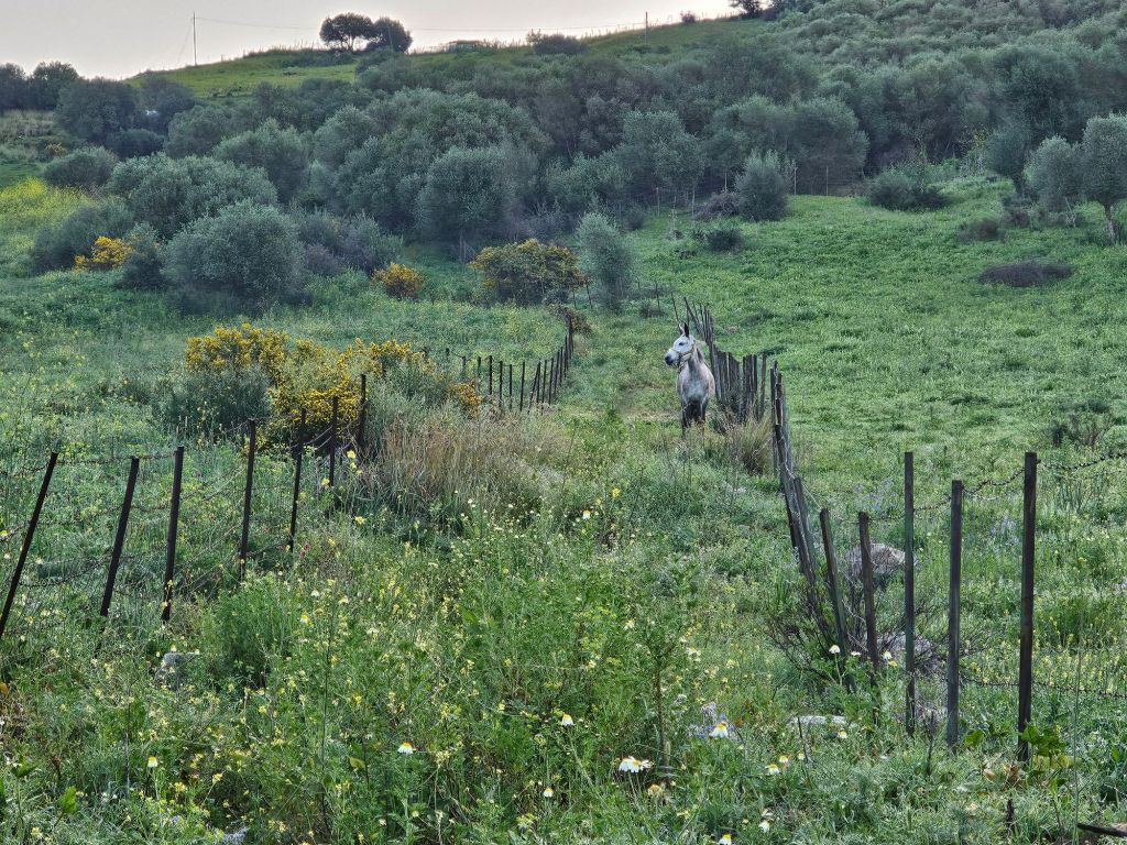 Up the hill on a path between 2 barbed wire fences, about 3 m apart. Look up ahead – is that a person? No, a horse. Or is it a donkey? Neither of us is an animal lover, so we prefer not to be within kicking distance of large animals. Why won’t it retreat before us, so we don’t have to get close? It looks skittish. We pretended we were horsey and proceeded carefully. Turned out that it was tethered on a 30-ft rope. It backed up to the end and when we got close, it darted past us to the other end of its rope.